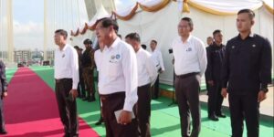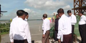 On their arrival at the venue, Union Minister for Construction U Myo Thant reported on the salient points of the bridge construction project. At the auspicious time, the Acting President formaly opened the ceremony to pour concrete for bridge joining. After the ceremony, the Acting President and party inspected the progress of bridge construction.