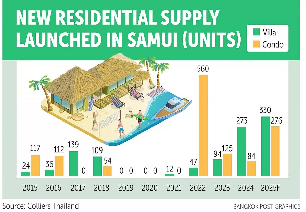 The Samui property market now mirrors Phuket’s 2022 peak, with newly launched villas reaching a 15-year high and land prices up 10%, according to property consultancy Colliers Thailand.