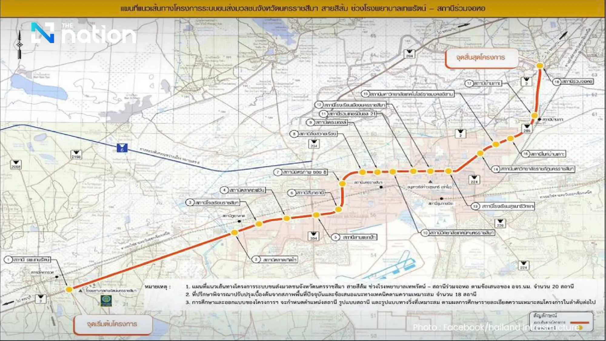 The Nakhon Ratchasima Mass Transit Project, Orange Line, spans 18.9 kilometres and includes 20 stations: