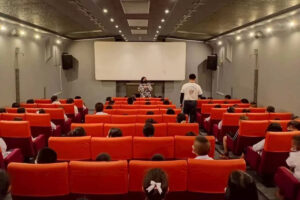 Students prepare for their first cinemobile learning experience in the 100-seat cinema on wheels. (Photo supplied)