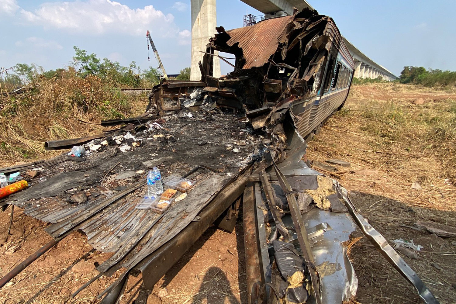 Wreckage at the site where a train was derailed when a construction crane collapsed and fell onto its carriages in Sikhiu district, Nakhon Ratchasima province. (Photo: Prasit Tangprasert)