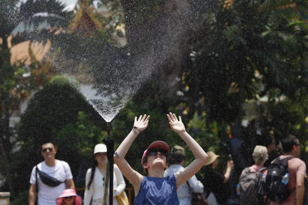 นักท่องเที่ยวเพลิดเพลินกับน้ำพุที่ติดตั้งไว้ที่วัดโพธิ์ (วัดพระนอน) ในกรุงเทพฯ เพื่อคลายร้อนในช่วงฤดูร้อนปี 2567 (ภาพ: ปัทธราพงษ์ ชาติปัทธราซิล)