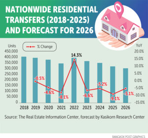 The residential market is expected to contract for a fourth consecutive year in 2026, with nationwide transfers projected to fall by 5.1% year-on-year to around 300,000 units, the lowest level in years, reflecting fragile buying activity, according to Kasikorn Research Center.