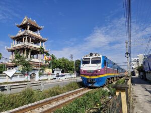 ภาพรถไฟบนทางรถไฟรางเดี่ยวขนาด 1 เมตร ผ่านเมืองน้ำดินห์ ประเทศเวียดนาม
